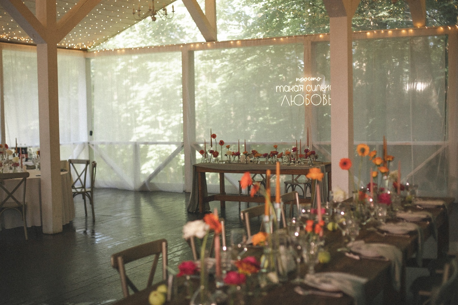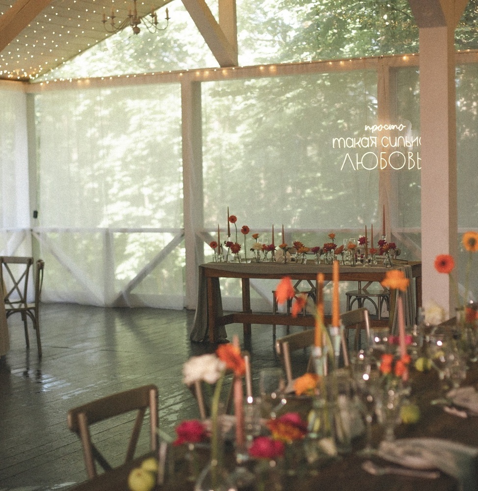 Идея с размещением гостей в коттедже и загородной площадкой для банкета по соседству - сошлись в единой концепции. Было создано все для классного и веселого отдыха! Пара разрешила себе быть смелыми и воплотить все буйство эмоций в декоре и настроении праздника. Стильная фотосессия, фуршет с играми на природе, банкет с жаркими танцами, торт под огни фейрверка. Гости оценили!