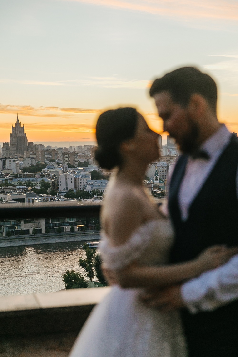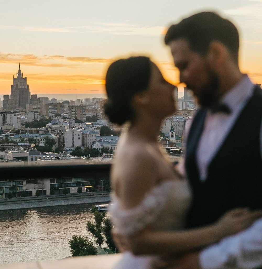 Когда нужно описать свадьбу коротко, то пожалуй главной фишкой свадьбы Артема и Леры будет: самасшедший, умопомрачительный закат с видом на панораму столицы! Сложно представить лучший фон свадебной открытки для love-story.